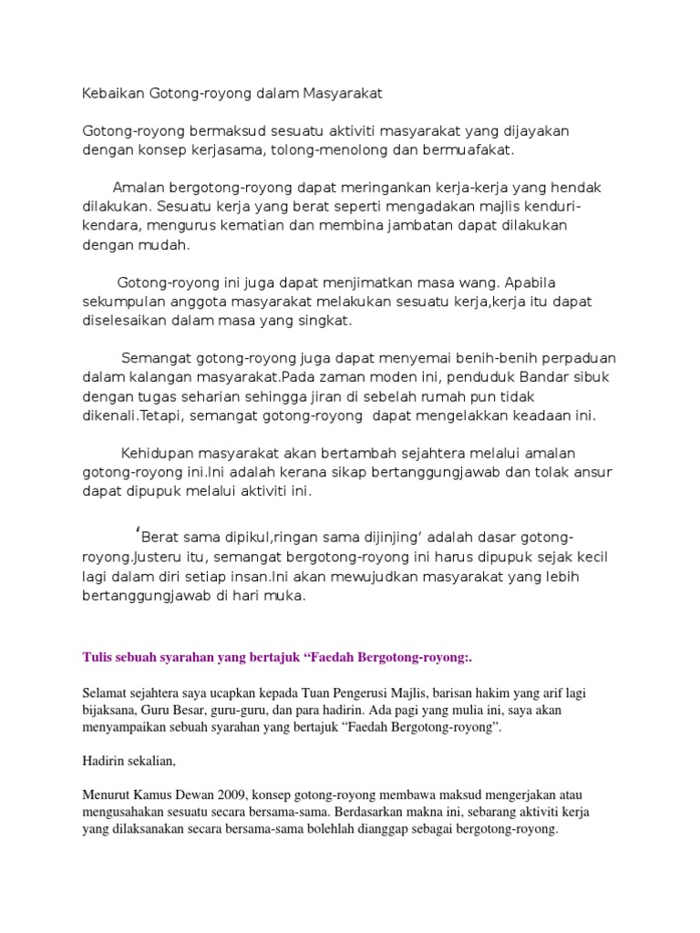 Contoh karangan faedah amalan gotong royong. Amalan ini merupakan budaya yang dipraktikkan sejak generasi dulu dan amalan ini dianggap tak basah dek hujan tak lekang dek panas. Sebagai contoh aktiviti gotong-royong dianjurkan oleh Pihak Berkuasa Tempatan untuk membersihkan kawasan persekitaran dewan serbaguna komuniti setempat.
